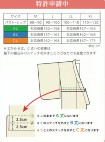 You can easily adjust the length (from A to C) by removing the stitches sewn under the arm.